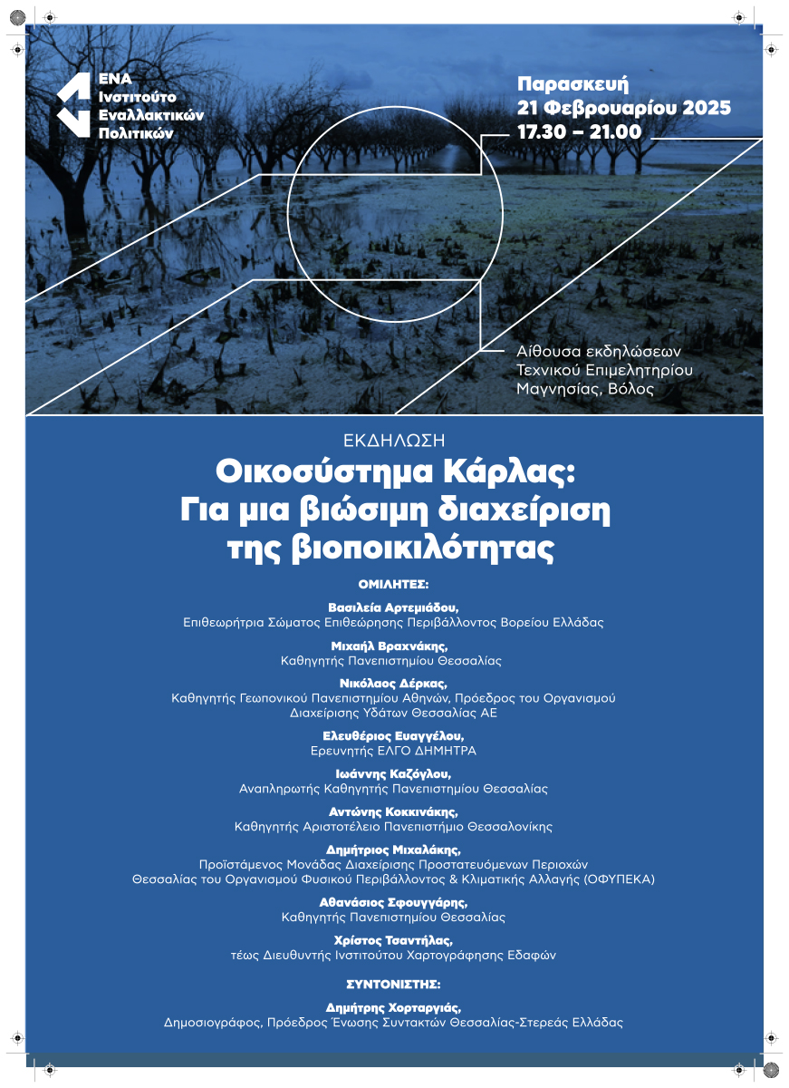 Ημερίδα με θέμα «Οικοσύστημα Κάρλας: Για μια βιώσιμη διαχείριση της βιοποικιλότητας», διοργανώνει το Ινστιτούτο Εναλλακτικών Πολιτικών (ΕΝΑ) την Παρασκευή 21 Φεβρουαρίου 2025, στην Αίθουσα εκδηλώσεων Τεχνικού Επιμελητηρίου Μαγνησίας στο Βόλο. Το πρόγραμμα της ημερίδας, που θα ξεκινήσει στις 5.30 το απόγευμα της Παρασκευής, έχει ως εξής: