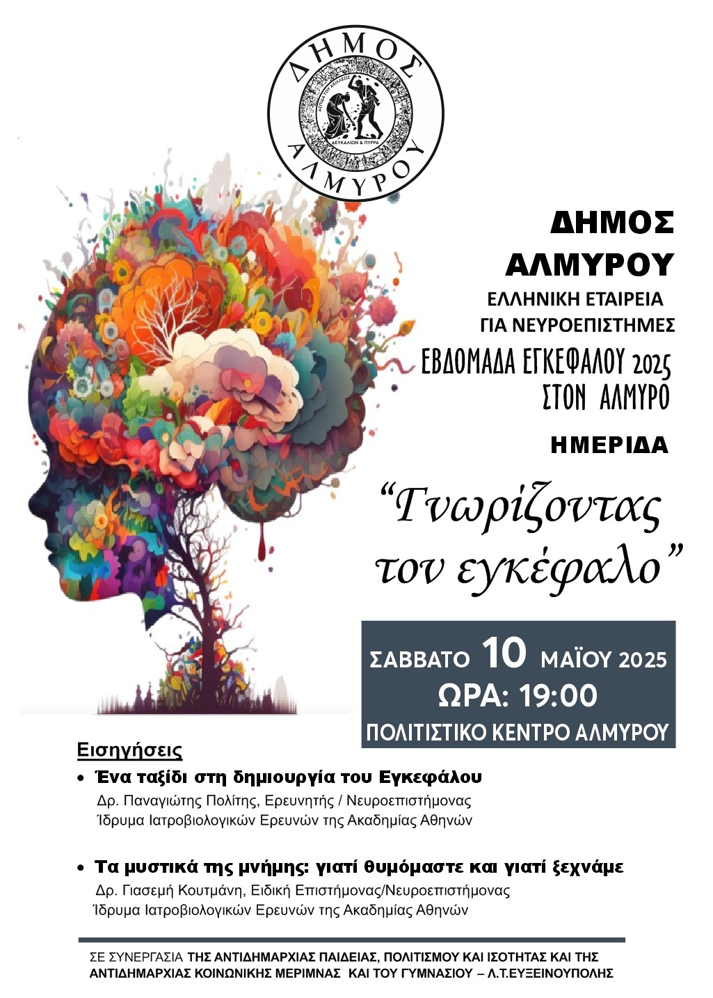 Ο Δήμος Αλμυρού διοργανώνει ημερίδα το Σάββατο 10 Μαΐου 2025, στις 19:00 στο Πολιτιστικό Κέντρο Αλμυρού, σε συνεργασία με την Αντιδημαρχία Παιδείας, Πολιτισμού και Ισότητας, την Αντιδημαρχία Κοινωνικής μέριμνας και τους μαθητές του Γυμνασίου-Λ.Τ. Ευξεινούπολης στα πλαίσια της “Εβδομάδας Ευαισθητοποίησης για τον Εγκέφαλο-2025”.