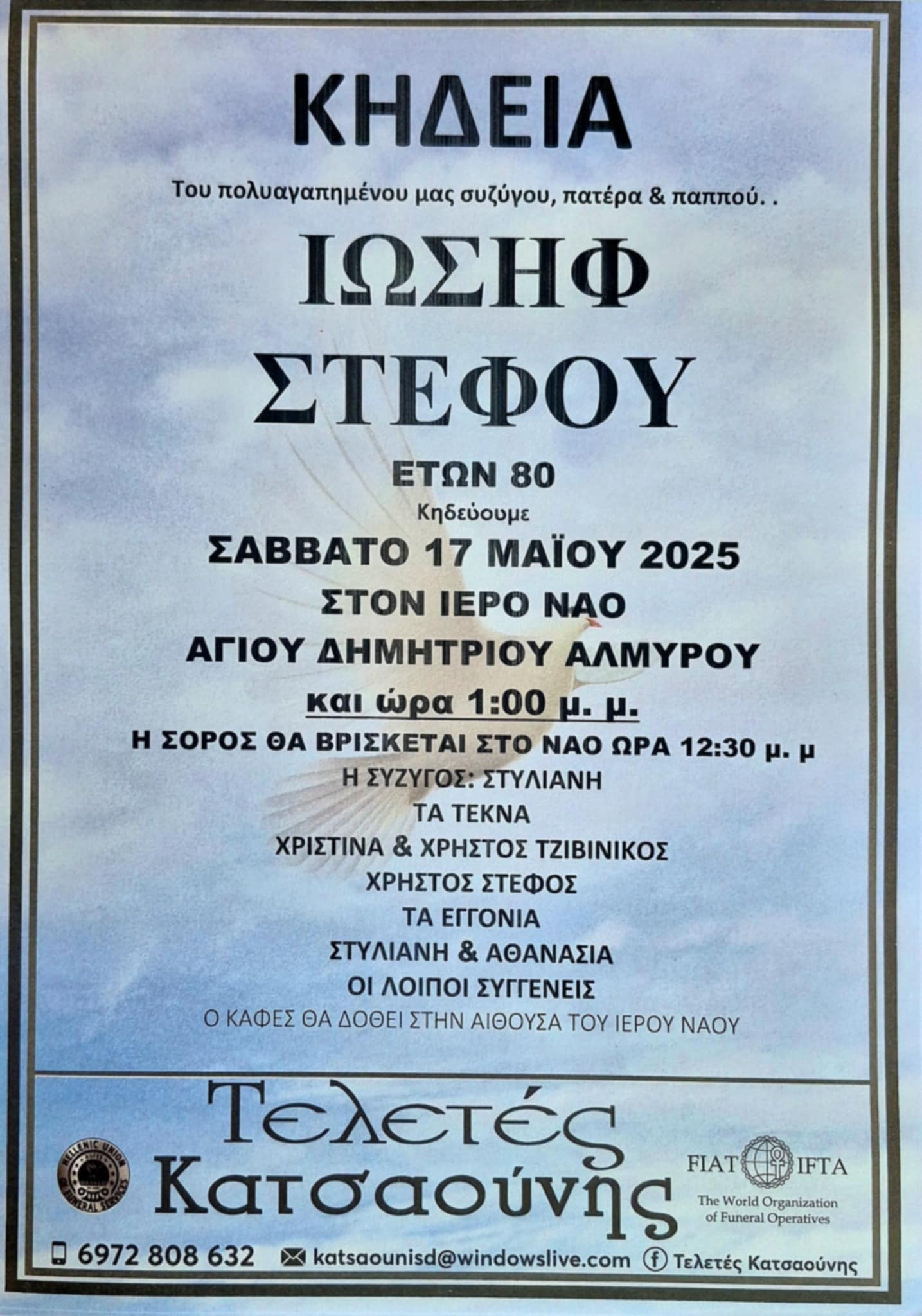 Σε ηλικία 80 ετών έφυγε από τη ζωή ο Ιωσήφ Στέφος. Η κηδεία θα γίνει από τον Ιερό Ναό Αγίου Δημητρίου Αλμυρού το μεσημέρι του Σαββάτου 17 Μαΐου.