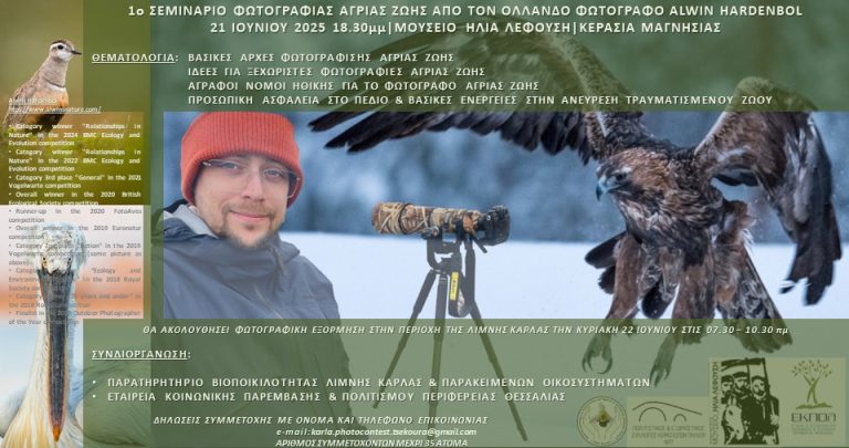 Στο σεμινάριο που θα πραγματοποιηθεί το Σάββατο στο “Μουσείο Ηλία Λεφούση”  θα διδάξει ο Ελληνοολλανδός βραβευμένος φωτογράφος φύσης Alwin Hardenbol και η εκδήλωση συνδιοργανώνεται από το Παρατηρητήριο Βιοποικιλότητας Λίμνης Κάρλας και την Εταιρεία Κοινωνικής Παρέμβασης και Πολιτισμού (ΕΚΠΟΛ) της  Περιφέρειας Θεσσαλίας.