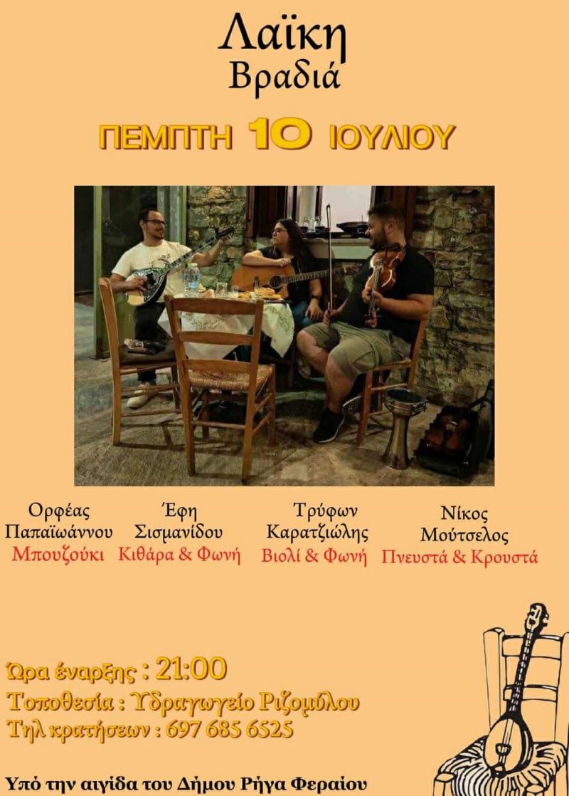 Ετοιμαστείτε για μια μουσική βραδιά που θα σας ταξιδέψει! Την Πέμπτη 10 Ιουλίου, στις 21:00, στο Υδραγωγείο Ριζομύλου θα φιλοξενηθεί μια ξεχωριστή Λαϊκή Βραδιά, με ένα σχήμα ταλαντούχων μουσικών που θα σας χαρίσουν αξέχαστες στιγμές.