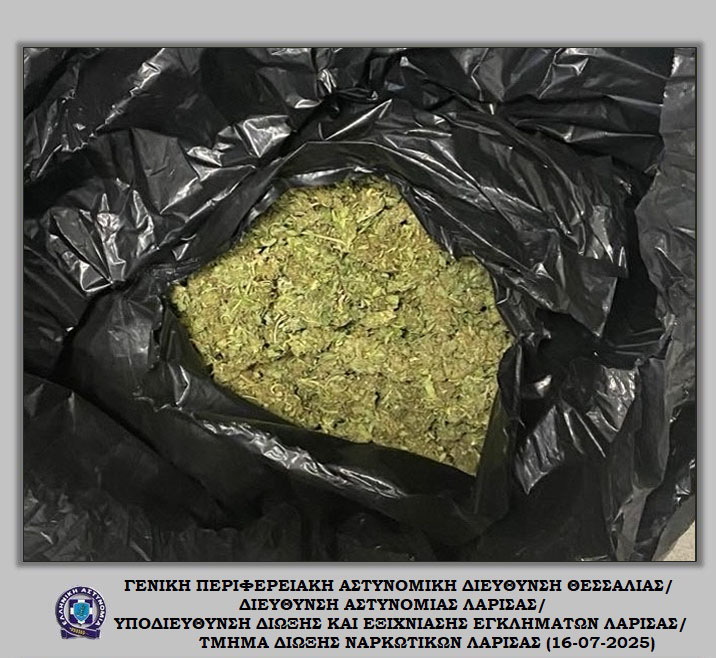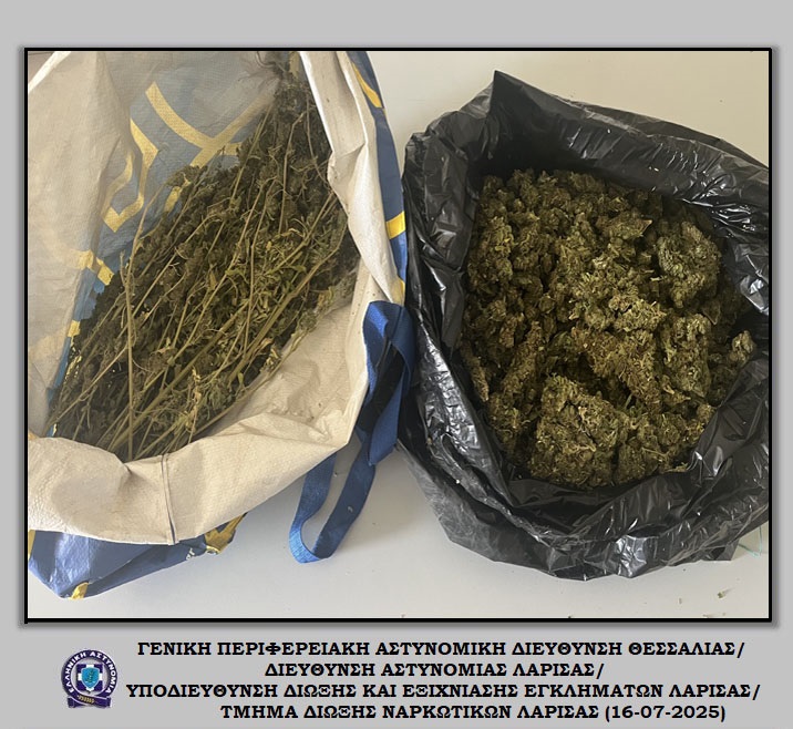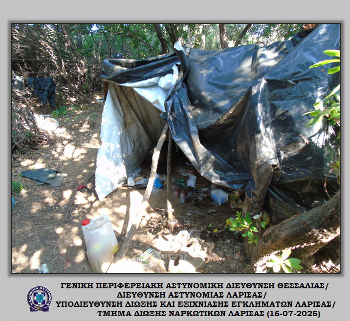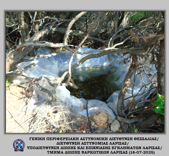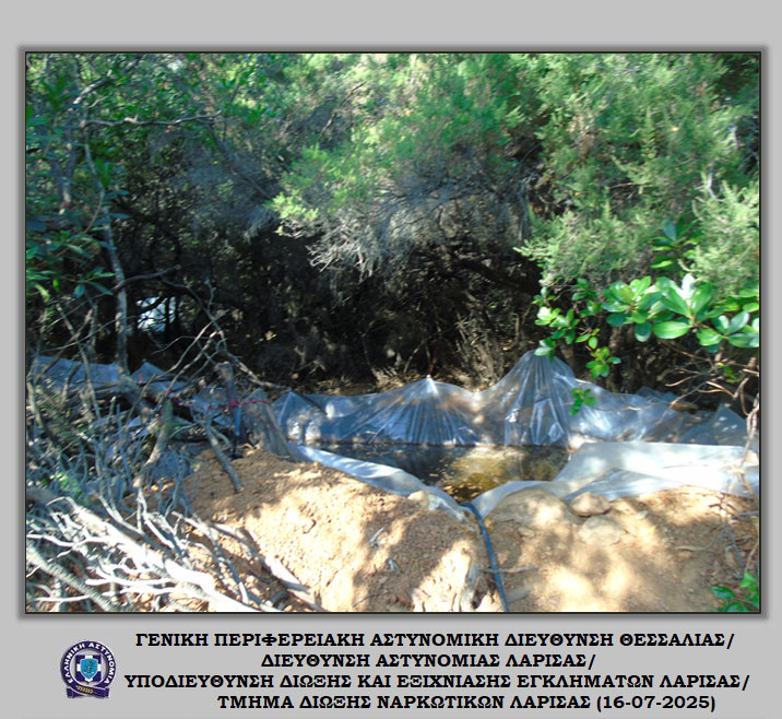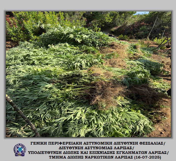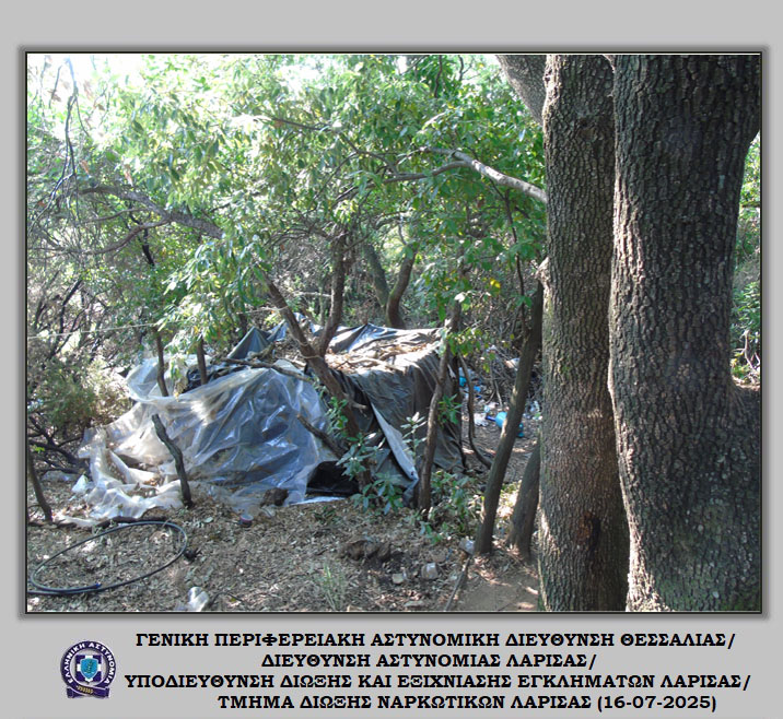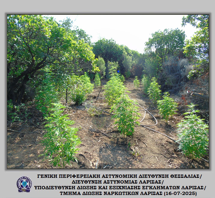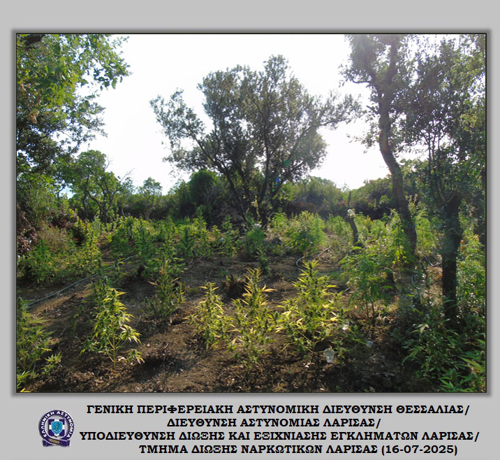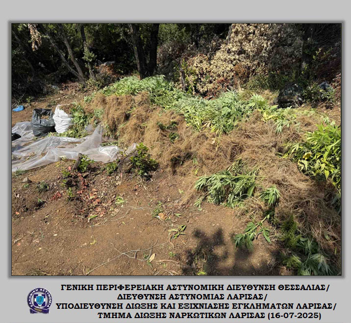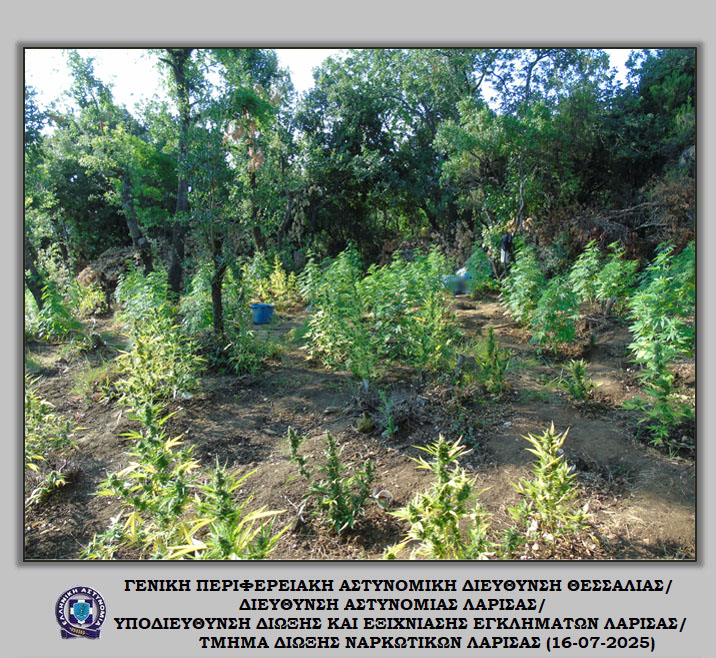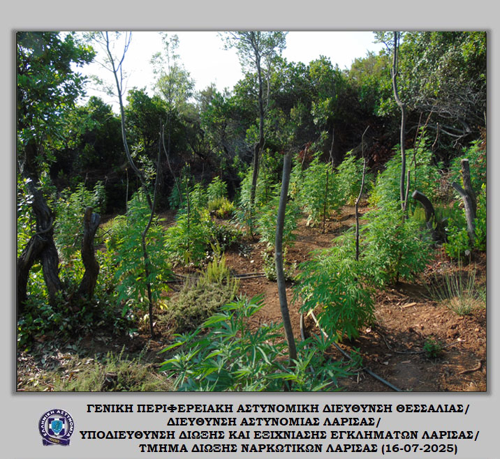 «Διακριβώθηκε η δράση εγκληματικής ομάδας που δραστηριοποιούνταν στη καλλιέργεια ιδιαίτερα μεγάλου αριθμού δενδρυλλίων κάνναβης σε δύσβατη δασική περιοχή του Δήμου Αγιάς Λάρισας. Στο πλαίσιο συντονισμένης αστυνομικής επιχείρησης που ξεκίνησε πρωινές ώρες προχθές, Δευτέρα 14 Ιουλίου 2025, εντοπίστηκε ευρείας έκτασης φυτεία με συνολικά -6.235- δενδρύλλια κάνναβης. Η εν λόγω φυτεία εκτεινόταν σε -24- διαζώματα που ενώνονταν μεταξύ τους με μονοπάτια, καλύπτοντας συνολική έκταση -10- στρεμμάτων περίπου.
