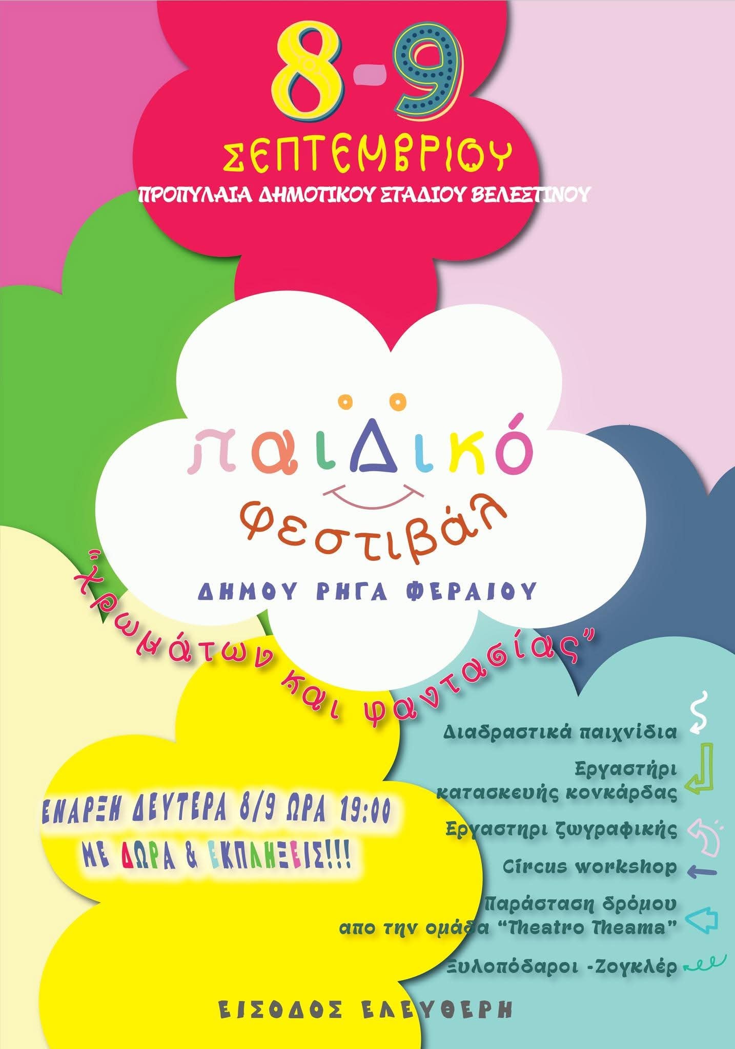 Μία εκδήλωση διαφορετική από τις συνηθισμένες αυτής της περιόδου διοργανώνει ο Δήμος Ρήγα Φεραίου στο πλαίσιοεκδηλώσεων της εμποροπανήγυρης καθώς σήμερα Δευτέρα κι αύριο Τρίτη 9/9, στο Βελεστίνο θα πραγματοποιηθεί το 1ο Παιδικό Φεστιβάλ, με πολλές δρασηριότητες κι εκπλήξεις για μικρούς και μεγάλους! Δείτε τις σχετικές αφίσες: