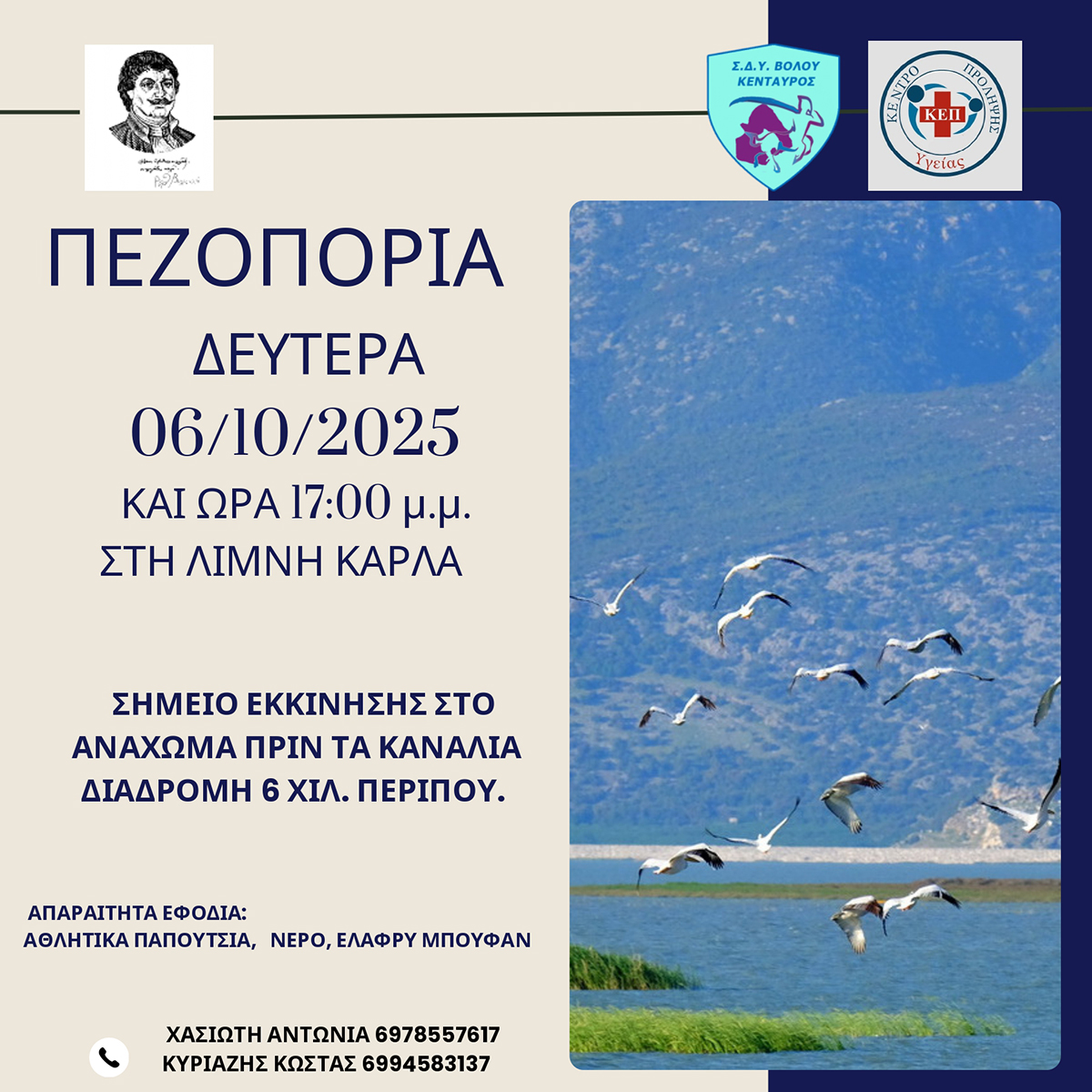 Το ΚΕΠ Υγείας του Δήμου Ρήγα Φεραίου, σε συνεργασία με τον Σύλλογο Δρομέων Βόλου «Κένταυρος», προσκαλεί μικρούς και μεγάλους σε μια όμορφη πεζοπορία στη Λίμνη Κάρλα, τη Δευτέρα 6 Οκτωβρίου 2025 και ώρα 17:00.