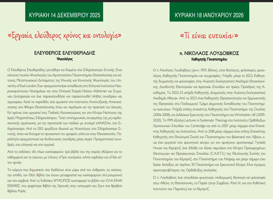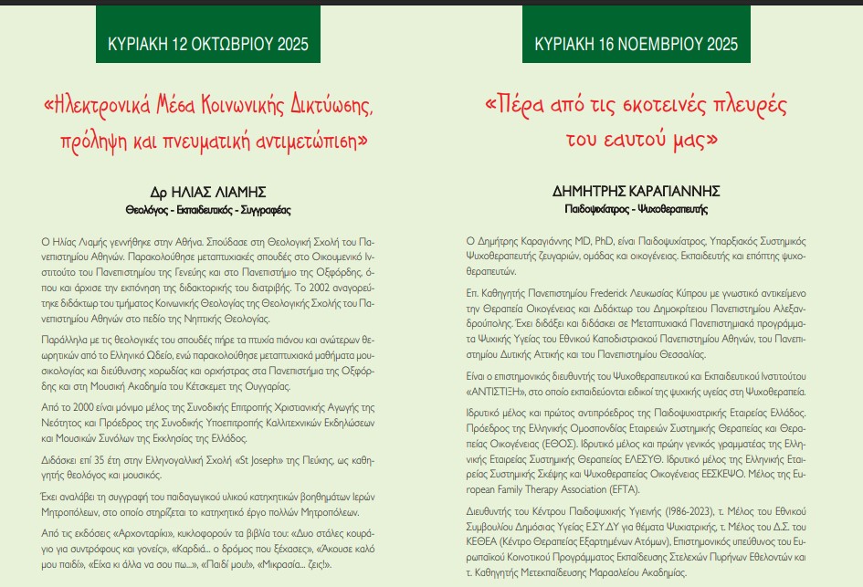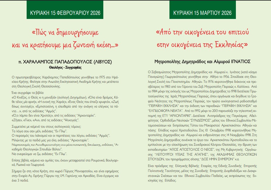 Η 1η Συνάντηση για το νέο κύκλο θα πραγματοποιηθεί την Κυριακή 12 Οκτωβρίου 2025, στις 11:00 π.μ., στο Συνεδριακό Κέντρο Θεσσαλίας. Ομιλητής θα είναι ο Δρ Ηλίας Λιαμής, Θεολόγος, Εκπαιδευτικός και Συγγραφέας, ο οποίος θα αναπτύξει το θέμα: «Ηλεκτρονικά Μέσα Κοινωνικής Δικτύωσης, πρόληψη και πνευματική αντιμετώπιση».