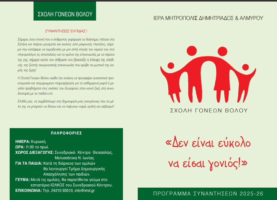 Στο πλαίσιο της ποιμαντικής μέριμνας της Ιεράς Μητροπόλεως Δημητριάδος για τον ευαίσθητο και πολυδιάστατα δοκιμαζόμενο στις μέρες μας ιερό θεσμό της Οικογένειας, θα λειτουργήσει και φέτος η Σχολή Γονέων Βόλου. Η Σχολή απευθύνεται σε νέους και υποψήφιους γονείς, αλλά και σε κάθε ενδιαφερόμενο που επιθυμεί να στηρίξει και να ενισχύσει τη σύγχρονη οικογένεια μέσα στις προκλήσεις της εποχής.