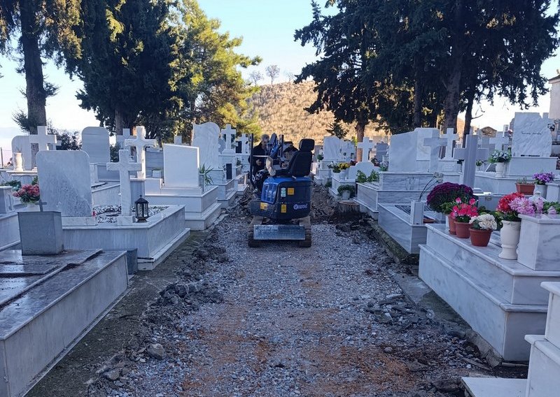 Α.Π.: Εκεί δεν μπορούν να γίνουν εργασίες. Δεν επιτρέπεται. Μπορούμε να κάνουμε μόνο καθαριότητα γιατί εκεί πρέπει να γίνει τομή κανονική. Πρέπει να βγει ένα κονδύλι ή να αλλάξει μέρος το κοιμητήριο -που εγώ αυτή την πρόταση είχα και συζητάμε να σας πω την αλήθεια με τον Δήμαρχο. Να μπει σε ένα ίσιο μέρος, να επιλεγεί ένα χωράφι ας πούμε, να το αγοράσουμε… αλλά και εκεί πρέπει να υπάρχει μελέτη από το πανεπιστήμιο γιατί μπαίνουν νεκροί μέσα πως θα είναι τα αποστραγγιστικά κτλ.  Είναι πολύπλοκη η διαδικασία. Αυτό που μπορούμε να κάνουμε στο πάνω το τμήμα είναι απλά να το καθαρίζουμε και αν αποφασίσουμε ως Δήμος να μείνουμε εκεί θα πρέπει να κάνουμε  τομές μεγάλες να χαράξουμε διαδρόμους, φυσικά να γκρεμίσουμε μνήματα να χαράξουμε διαδρόμους και να γίνει ανθρώπινο. Το μεσαίο το τμήμα είναι καλό. Οι εργασίες τώρα γίνονται στο μεσαίο το τμήμα. Πέρυσι είχαμε ξεκινήσει και στην πίσω την πλευρά είχαμε κάνει κάποιες αποψιλώσεις. Είχαν μπει τα τσαπάκια μέσα και χάλασαν τον κεντρικό το διάδρομο –που ήταν ήδη χαλασμένος. Κόψαμε τέσσερα δέντρα που ήταν απαραίτητα γιατί εκεί, όπως καταλαβαίνετε θα πρέπει να μπαίνει και ένα αγροτικό μηχάνημα, μέσα να τον ανοίξουμε λίγο το διάδρομο. Στο κάτω το τμήμα δεν έχουν γίνει πολλές ταφές γιατί προσπαθούμε να περιορίσουμε και να εκμεταλλευτούμε τις εκταφές που γίνονται στο μεσαίο το τμήμα και στο επάνω, ώστε να προσπαθήσουμε όσο μπορούμε περισσότερο να κρατήσουμε λίγο τη λειτουργία αυτή και να έχουμε θέσεις. Πρέπει ο κόσμος να  αντιληφθεί ότι πρέπει να γίνονται στην ώρα τους οι εκταφές. Παλιότερα πλήρωναν στον άνθρωπο που έκανε την ταφή ή την εκταφή 150 ευρώ. Δύσκολη η δουλειά τους, δεν γίνεται εύκολα αυτή η δουλειά, θέλει θάρρος, θέλει και λίγο ψυχή παραπάνω… Πλέον μέσα στον κανονισμό λειτουργίας το έχουμε προσαρμόσει αυτό, το έχουμε αναθέσει σε εργολάβο, με δικούς μας ανθρώπους φυσικά. Πηγαίνει ο συγγενής στο ληξιαρχείο δηλώνει το θάνατο, πληρώνει το αντίτιμο των 80 ευρώ και την ταφή και την εκταφή την αναλαμβάνει ο Δήμος. Έτσι ξέρουμε πότε απεβίωσε ο άνθρωπος, πότε είναι να γίνει η εκταφή, να υπάρχει ένας μπούσουλας.