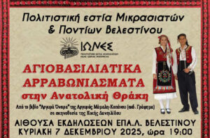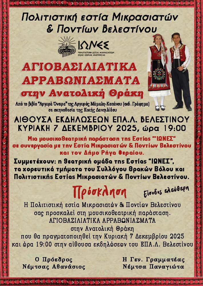 Την Κυριακή 7 Δεκεμβρίου 2025, στις 19:00, στην Αίθουσα Εκδηλώσεων ΕΠΑ.Λ. Βελεστίνου, θα έχετε την ευκαιρία να παρακολουθήσετε τη μουσικοθεατρική παράσταση «Αγιοβασιλιάτικα Αρραβωνιάσματα στην Ανατολική Θράκη».