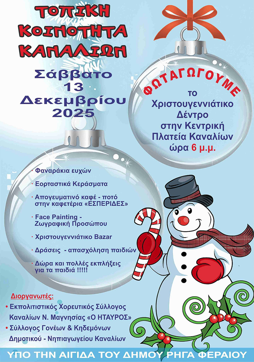 Η Τοπική Κοινότητα Καναλίων διοργανώνει το Σάββατο 13 Δεκεμβρίου 2025 μια σειρά εορταστικών δράσεων με αφορμή τη φωταγώγηση των Χριστουγεννιάτικων δέντρων.