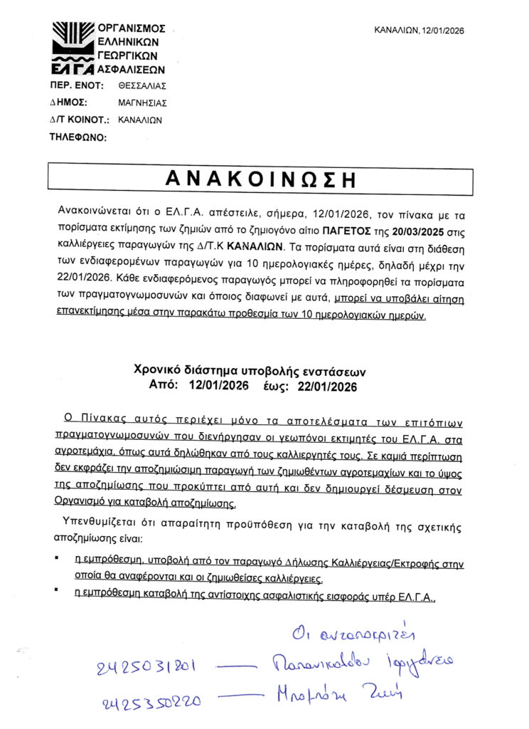 Ανακοινώνεται από τον ΕΛ.Γ.Α. ότι απεστάλησαν χθες, 12 Ιανουαρίου 2026, οι πίνακες με τα πορίσματα εκτίμησης των ζημιών που προκλήθηκαν από τον ΠΑΓΕΤΟ της 20/03/2025 στις καλλιέργειες των παραγωγών της Δημοτικής/Τοπικής Κοινότητας Καναλίων.