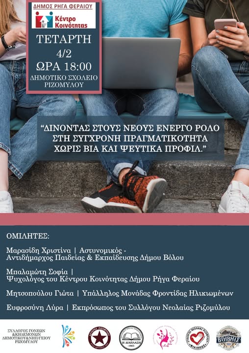 Εκδήλωση με τίτλο “Δίνοντας στους νέους ενεργό ρόλο στην σύγχονη πραγματικότητα χωρίς βία και ψεύτικα προφίλ” θα πραγματοποιηθεί την Τετάρτη 4 Φεβρουαρίου 2026, στο Δημοτικό σχολείο Ριζομύλου. Η εκδήλωση είναι προϊόν συνεργασίας του Κέντρου Κοινότητας Δήμου Ρήγα Φεραίου και των τοπικών συλλόγων και περιλαμβάνει ομιλίες: από την Αστυνομικό-Αντιδήμαρχο Παιδείας Βόλου Χριστίνα Μαρασίδη, την ψυχολόγο του Κέντρου Κοινότητας Σοφία Μπαλαμώτη, την υπάλληλο μονάδας φροντίδας ηλικιωμένων Γιώτα Μητσοπούλου και την εκπρόσωπο του Συλλόγου Νεολαίας Ριζομύλου Ευφροσύνη Λύρα.