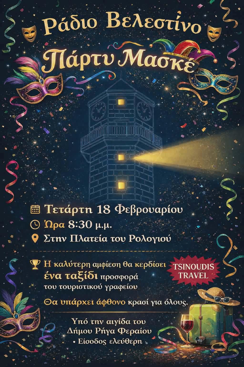 Το Ράδιο Βελεστίνο μάς προσκαλεί σε μια βραδιά γεμάτη κέφι, μουσική και χρώμα. Την Τετάρτη 18 Φεβρουαρίου, στις 8:30 μ.μ., η καρδιά της Αποκριάς χτυπά στην Πλατεία του Ρολογιού, σε μια εκδήλωση που υπόσχεται να μείνει αξέχαστη σε μικρούς και μεγάλους.
