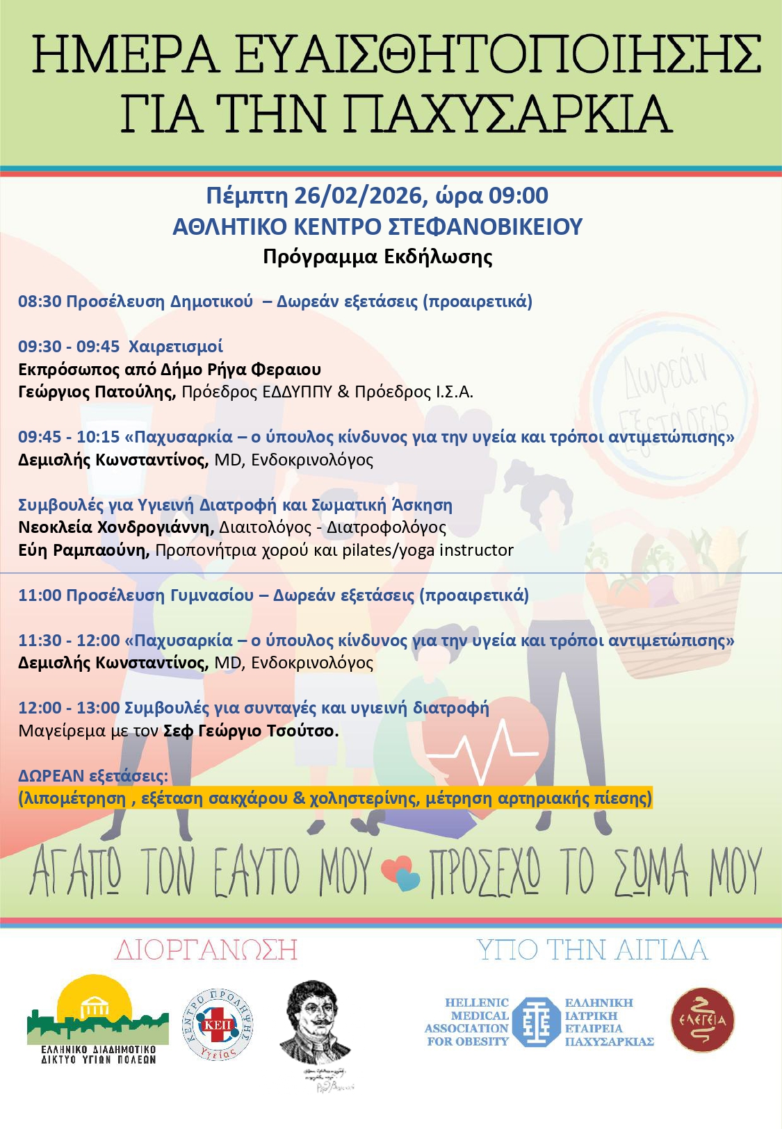 Εκδήλωση ευαισθητοποίησης των πολιτών για την παχυσαρκία διοργανώνει ο Δήμος Ρήγα Φεραίου, σε συνεργασία με το Ελληνικό Διαδημοτικό Δίκτυο Υγιών Πόλεων και το ΚΕΠ Υγείας του Δήμου. Θα πραγματοποιηθεί το πρωί της Πέμπτης 26/2 με έναρξη στις 09:00 στο αθλητικό κέντρο Στεφανοβικείου. Δείτε αναλυτικά το πρόγραμμα:
